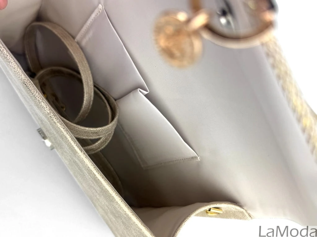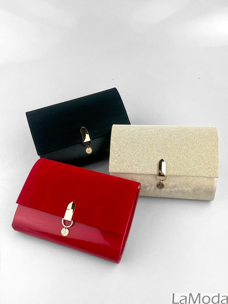 Możemy ją nosić w ręku, lub na eleganckim regulowanym pasku w kolorze torebki. Model znakomicie uzupełni każdą wieczorową kreację.